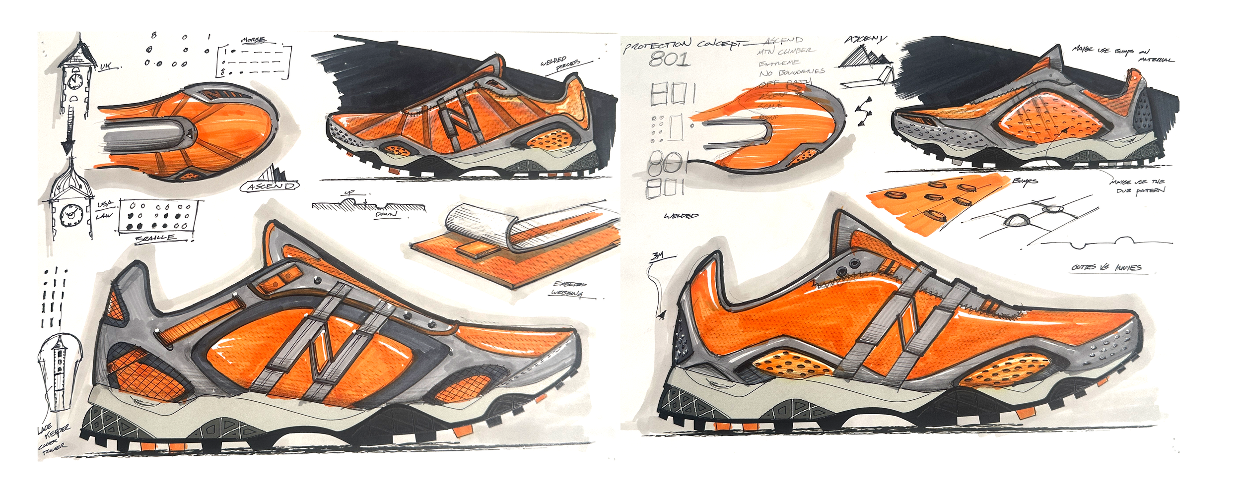 The final design connected the two clocktowers of both the Lawrence, MA New Balance design headquarters, and the Moot Hall clock tower in the UK where famous Fell running event, the Bob Graham Round, starts and ends.