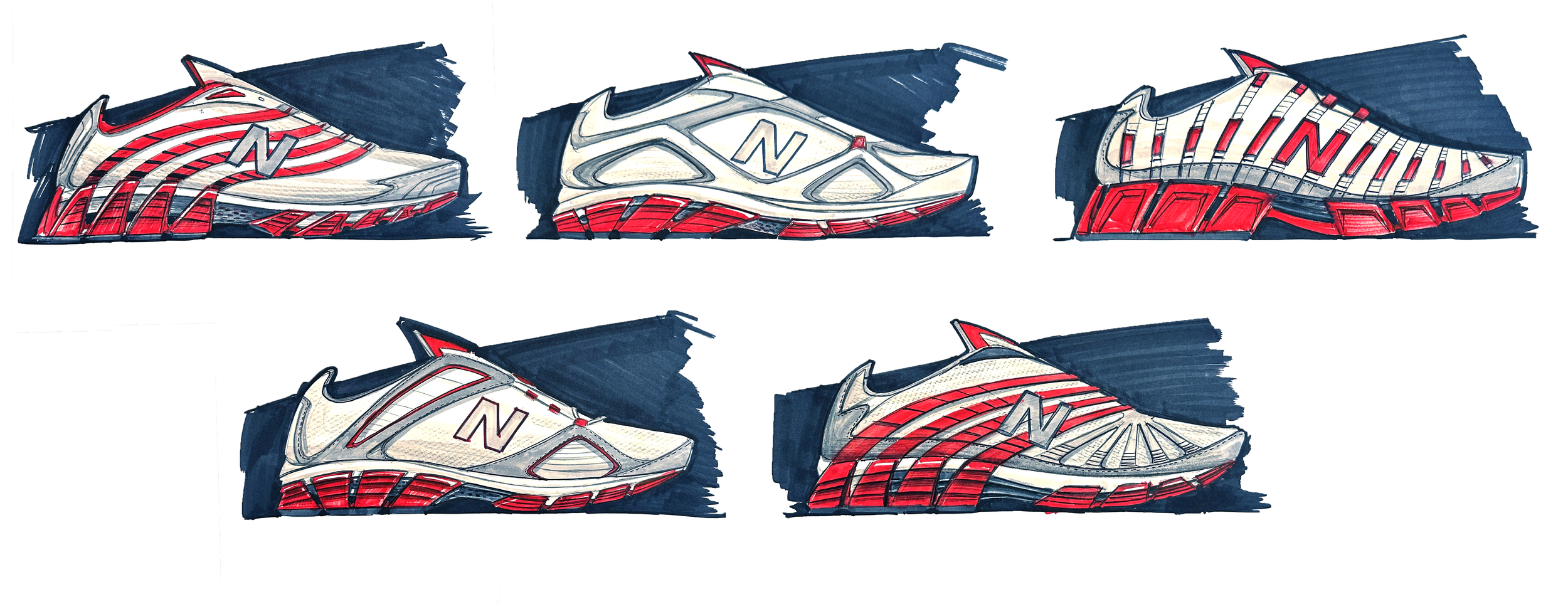 The goal was to take the dual density midsole story from other shoes and extend it from the heel to the whole foot. While this created some really great design opportunities for a fluid and graceful pairing with the dual midsoles, the engineering team had a tough time adapting it to manufacturing — a problem later overcome with the 645. This led to a stacked, sandwich look to the shoe that communicated the presence of the dual density foams, but didn’t convey the level speed or performance that I was hoping for in the initial sketches on the seen below.
